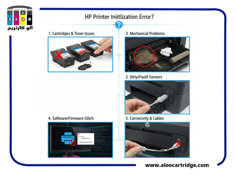 برای اینکه بدانیم چرا پرینتر HP ارور initializing میدهد آشنایی با دلایل احتمالی ضروری است. ریشه مشکل اغلب به یکی از پنج حوزه اصلی زیر برخواهد گشت: